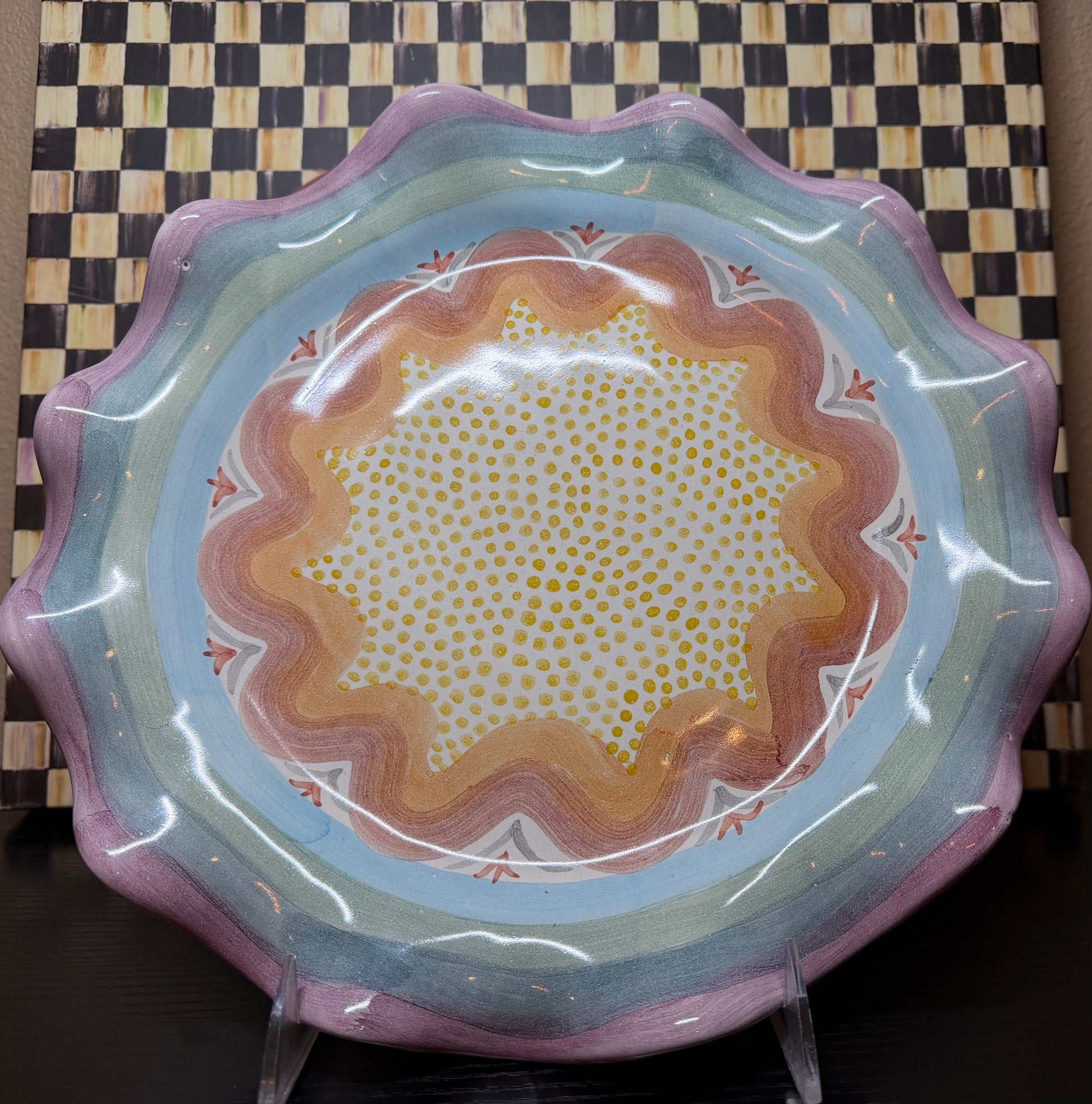 Bring instant garden-party charm to your table with this MacKenzie Childs Kukenhof Cheese Dome - a collector-favorite piece that’s equal parts functional serveware and display-worthy art. The hand-painted look features a dreamy pastel palette: a lavender-and-aqua scalloped platter with a sunburst center of golden dots, framed by soft peachy waves and delicate floral accents.
